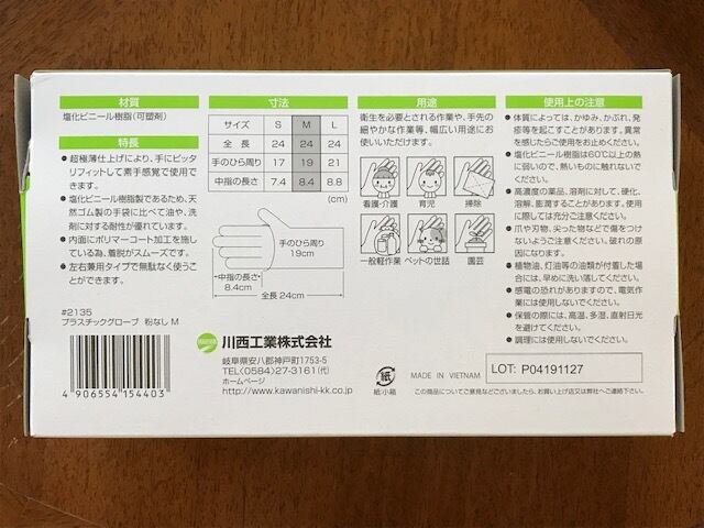 塩化ビニール樹脂製で、天然ゴム製の手袋に比べ、油や洗剤に対する耐性が優れています。