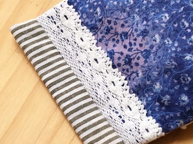 表側はプリント生地でパッチワーク風に、内側はさらし生地を使用しています。