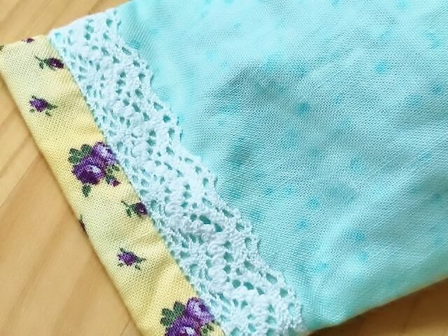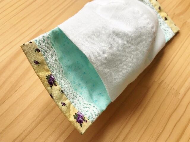 表側はプリント生地でパッチワーク風に、内側はさらし生地を使用しています。